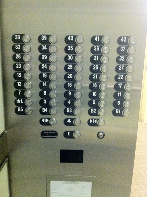I live in a high-rise which has, imaginably, elevators and then rows of buttons for all of the floors (42 in total). However, due to a desire to save space or perhaps sheer thoughtlessness on the part of the elevator company, the alignment of the buttons causes much confusion every day. No one can find the button to any floor other than the lobby or their own. Note on elevator the absence of the “wicked” number 13, this ruins the ratios so sometimes difference between numbers is 5 and others it is 6.