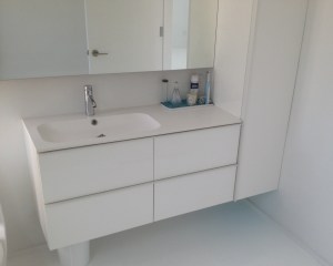 • In our bathroom, we used IKEA sink and cabinet models. The cabinet is flushed out to look built-in.
