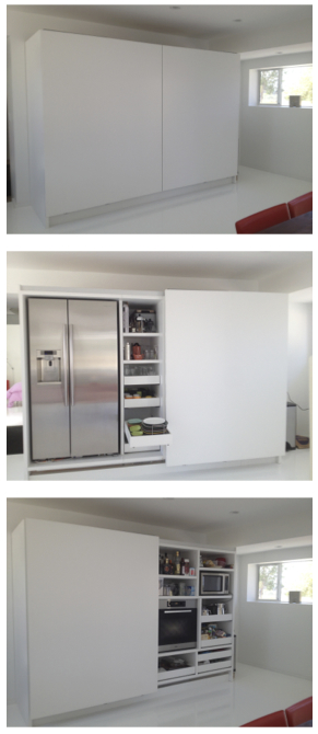 • The sliding door is Italian hardware, that easily hides the cheap refrigerator and oven. This is essentially the same stuff Boffi uses, but much less than a $10,000 bill from Boffi.